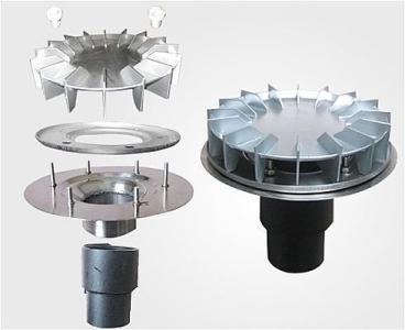 標(biāo)準(zhǔn)型的雨水斗,它是由雨水斗底座(PE材料),碟片(ASA),格柵頂蓋(PE)組成。另外根據(jù)需要可提供通用型的絕緣底座,固定件,法蘭片,焊接片,防火保護帽,微型加熱電圈等配件。雨水斗額定流量分12L/s 、25L/s、40L/s、60L/s和72L/s等,最常用的為25L/s和40L/s兩種額定流量的雨水斗。